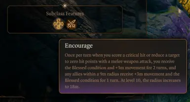 1、当你用近战武器攻击获得暴击或将目标生命值降低到零时,每回合一次,你会获得祝福状态和 +3m 移动力,持续 2 回合,半径 9m 内的任何盟友都会获得祝福状态和 +3m 移动力,持续 1 回合。10级时,半径增加到18m。