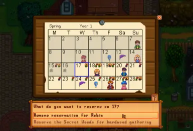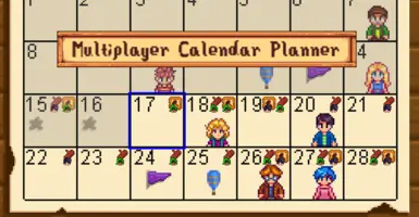 《星露谷物语》多人游戏日历规划器MOD,这是一个为多人游戏添加协作日历系统的mod。它允许玩家为Robin的建筑项目或在Secret Woods收集木材等活动保留和取消保留天数,确保所有玩家保持同步。