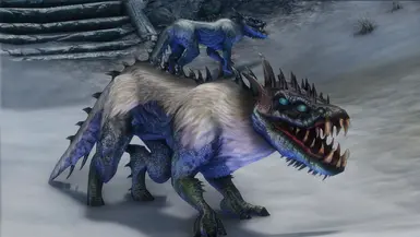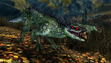 《上古卷轴5:天际重制版》杜尔佐格斯怪物MOD,Durzogs 是肉食性动物,在外观和行为上都可以被描述为几乎是爬行动物的狗,尽管存在一些显着差异:它们有条纹绿色鳞片状皮肤,六只红色的眼睛,背部、头部、腿部和尾巴上有刺,还有专为撕裂而设计的大牙齿和爪子。他们经常被哥布林部落驯化。