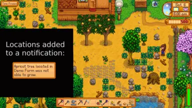 《星露谷物语》查找失败的果树MOD,一棵无法生长的果树有点烦人。不知道那棵果树在哪里可能更烦人。这个 mod 添加了一个通知,除了游戏自己的通知外,还包括果树无法生长的位置的名称。它还会在控制台中打印坐标供您参考。