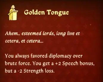 《天国:拯救2》黄金舌头福利MOD,你总是喜欢外交而不是蛮力。你会得到 +2 的言语加成,但会损失 -2 的力量。需要 1 个特长点才能解锁。