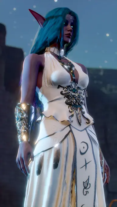 《博德之门3》月布长袍MOD,为玩家角色定制的《魔兽世界》风格的服装和盔甲。这件连衣裙采用紧身胸衣、分层和有图案的罩裙和带有她经典符号的正面布料。此外,还配有镶嵌宝石的装饰品,一只手臂上有一个银色的金银丝护腕,另一只手臂上有三个手镯。