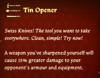 《天国:拯救2》开罐器特权MOD,你自己磨砺的武器会对对手的盔甲和装备造成 %15 更大的伤害。将 KCD1 中的一个特权带到 KCD2 中,作为 Craftsmanship 分支中的新独立特权。