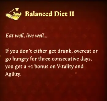 《天国:拯救2》均衡的饮食MOD,如果你连续三天没有喝醉、暴饮暴食或挨饿,你会获得 +1 的活力和敏捷加成。