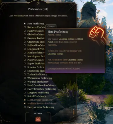 《博德之门3》家酿拳头熟练度MOD,在熟练度列表中添加了一个名为“Fist Proficiency”的新选项。目标是使所有职业都能够围绕徒手攻击进行构建。