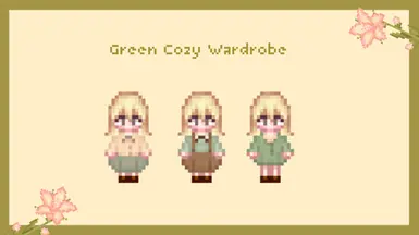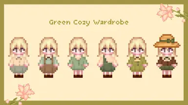 《星露谷物语》绿色舒适衣柜MOD,6 套绿色调的舒适服装 + 一顶带蝴蝶结的草帽,非常适合为您的农场带来季节性风格。