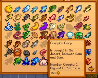 《星露谷物语》一次又一次地钓鱼MOD,您是否设法找到了一条鱼,但不知道如何再次找到它?这是我经常遇到的问题,所以我做了一个 mod 来解决这个问题。所有鱼、蟹笼鱼等的描述现在都已更改,以显示在哪里以及如何捕捉它们。