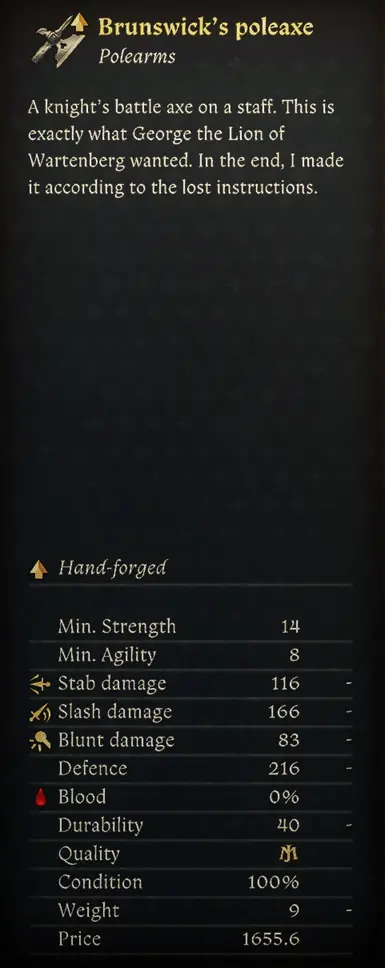 1、将 Brunswick 的 Poleaxe 提升到与普通 Poleaxe 相同的属性。
