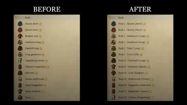 《天国:拯救2》已排序的库存MOD,这个 Mod 重命名了大多数物品以改善库存排序。请参阅图片以获取示例。