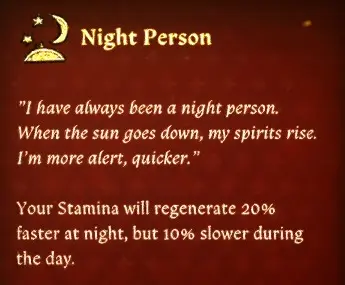 《天国:拯救2》夜行者福利MOD,这个模组为你添加了夜行者特权,你的耐力在夜间恢复速度会加快 20%,但白天会慢 10%。需要 1 个特长点才能解锁。