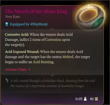 《博德之门3》腐蚀环MOD,为基础游戏中支持最少的元素之一 The Acid 赋予更多生命,这是一个戒指,它将使用此元素增强您的所有攻击,大大削弱您的敌人,将元素定向到支持,同时一旦您达到最大可能的减益,它会进一步提高您的伤害。
