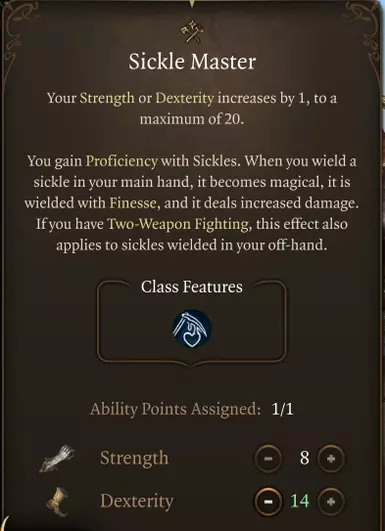 《博德之门3》自制技艺MOD,增加 1 点力量或敏捷,熟练掌握镰刀。当挥舞镰刀时,它们会自动变得神奇,使用它们很巧妙(使用 str 和 dex 之间的最高属性),并且它们造成的伤害更高。如果你有叫做“双武器格斗”的战斗风格,那么上述效果也适用于副手镰刀。