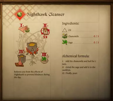 《天国:拯救2》夜鹰药水MOD,这个 mod 为游戏添加了一种新的药水,可以消除您的夜鹰效果。在 nighthawk 上度过了一夜的乳房后,在太阳升起时喝下它以保护您的眼睛。安装 Mod 时,您将自动学习配方。配方与洋甘菊煎剂几乎相同,但它使用油基,只需要一种洋甘菊。感兴趣的小伙伴快来3DM下载吧!