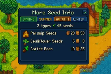 《星露谷物语》更多种子信息MOD,有了更多种子信息,这种麻烦就消失了:只需将鼠标悬停在任何种子上,即可立即查看背包和箱子中有多少种子——原版或模组添加。通过彩色标签按季节组织,您会立即知道是否值得购买异国情调的紫色花椰菜或将黄金留到以后使用。如果您讨厌浪费时间来回奔波并忘记已经购买的东西,那么这个模组适合您。感兴趣的小伙伴快来3DM下载吧!