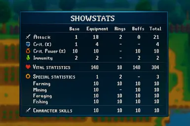 《星露谷物语》显示统计MOD,使用 ShowStats 深入了解角色的各个方面!该模组带来了干净的四列显示——基础、装备、戒指、增益——以及一个水晶般清晰的总数,可以准确地告诉您每个奖励的叠加情况。非常适合优化您的构建或只是惊叹于您的统计数据。感兴趣的小伙伴快来3DM下载吧!