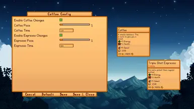 《星露谷物语》咖啡配置MOD,允许您完全自定义咖啡和三重浓缩咖啡的速度增益效果,以匹配您的游戏风格。无论您想要微妙的香草味体验,还是想要将您变成速度恶魔的强烈咖啡,这个模组都能满足您的需求。默认设置与原版行为完全匹配,但您可以通过游戏内配置菜单或直接编辑配置文件轻松调整这些设置。持续时间使用游戏时间单位,其中 1 约为 0.7 秒;下面提供了一些示例配置值。感兴趣的小伙伴快来3DM下载吧!