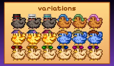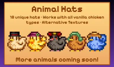 《星露谷物语》动物帽MOD,给你的农场动物可爱的化妆帽!该模组使用替代纹理为香草鸡添加了各种可爱的帽子设计。每只鸡都可以佩戴不同的配饰,您可以使用 AT 剪刀自由切换设计。感兴趣的小伙伴快来3DM下载吧!