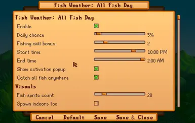 《星露谷物语》全鱼日MOD,这是一个罕见的夜间活动模组,能将平凡的一天变成奇异而激动人心的模组。鱼群游过陆地,每个钓鱼点都能钓到任何鱼。感兴趣的小伙伴快来3DM下载吧!