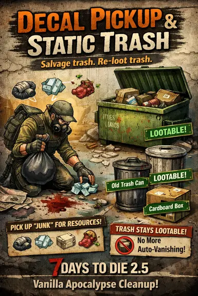 《七日杀》贴纸拾取与静电垃圾MOD,这个模组让普通世界的杂物表现得像真正的回收物品,并防止许多垃圾战利品容器在被搜获后自行删除。感兴趣的小伙伴快来3DM下载吧!