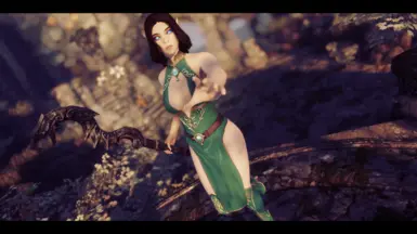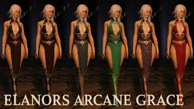 《上古卷轴5:天际重制版》奥数恩典服装MOD,你好,又有一款定制连衣裙发布了。这个模组包含一件连衣裙、一套鞋子和内裤。5种颜色组合(黑色、红色、蓝色、绿色、紫色)以及几种效果组合。