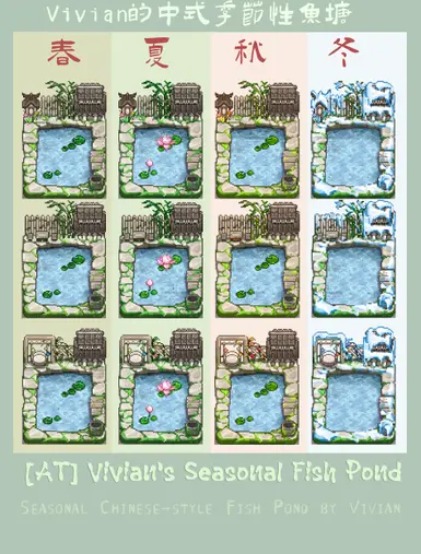 《星露谷物语》薇薇安的中式季节性鱼塘MOD,这个模组为你的游戏提供了薇薇安的中式季节性鱼塘外观。感兴趣的玩家快来3DM下载吧!