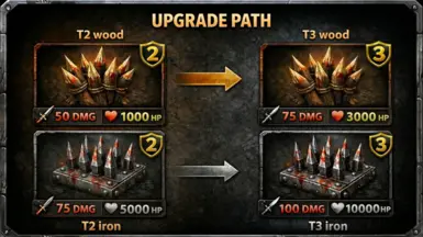 1、中带有伤害和生命值的尖刺陷阱改进- T2和T3,中带有伤害和生命值的刀刃陷阱改进- T2和T3。