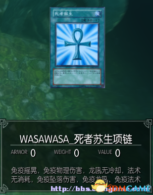 上古卷轴5:天际 死者复生神项链;由3DM论坛会员 mvpv5 制作分享,一款游戏王周边的项链,死者苏生……游戏王周边项链“死者苏生”乱入至上古5啦~附带52插槽和55插槽版(不至于浑身插槽都满了吧)穿戴时具有免疫摇晃,免疫物理伤害,龙吼无冷却,法术无消耗(包括耗魔的力量,次级力量。但不增加每日使用次数),免疫坠落伤害,免疫龙吼,免疫法术,水面行走这些效果。