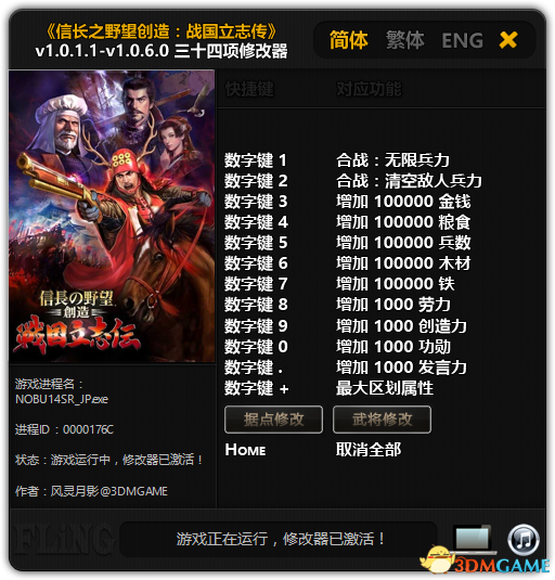1. “据点修改”和“武将修改”里的各种功能,当数值增加到最大值时下次再增加就会重置为1或0(“降低必要忠诚度”则是重置为最大值),如果觉得某些属性加得太多想重置,或者想减少某些据点或武将的属性可以用这种方法实现。