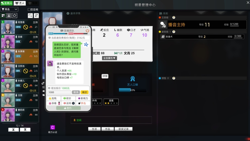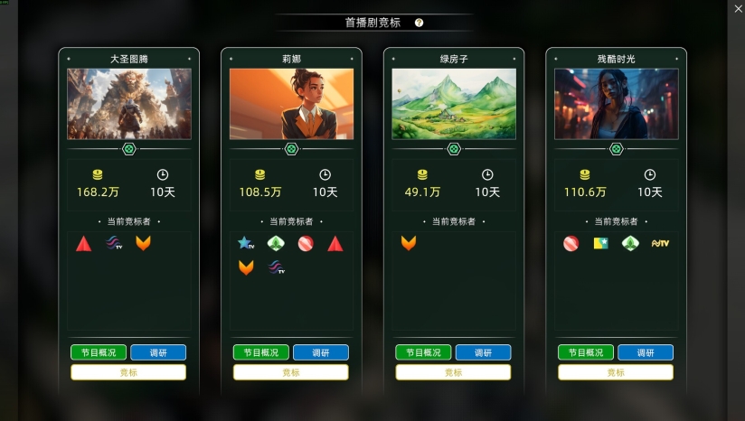 作为台长,玩家需要全面负责电视台的运营管理。核心玩法包括节目编排、收视率提升、广告招商和团队管理。玩家可以策划制作综艺、新闻、电视剧等多种类型的节目,通过合理的时段安排和内容策划来吸引观众。游戏还包含明星培养系统,玩家可以扮演星探发掘潜力新人,并通过上节目、出外景等方式将其培养为顶流艺人。此外,玩家需要参与首播节目拍卖竞标,管理电视台园区建设,并应对各种突发事件对收视率的影响。