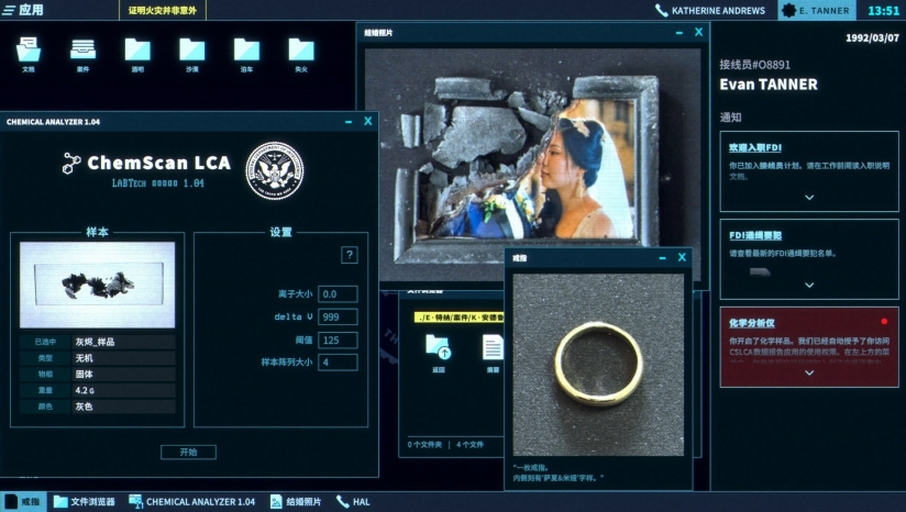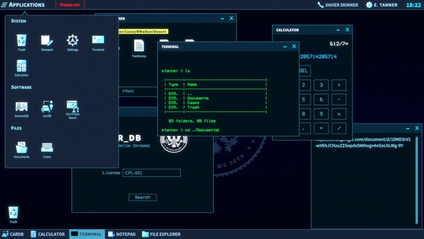 采用科技感十足的复古办公UI。游戏屏幕就像公司里用的办公电脑。桌面上有聊天框、与工作相关的文件夹和回收站。玩家在浏览案件信息和查阅资料时,也是通过不同的任务窗口进行展示,操作方式和自己电脑上的类似,增加了玩家的代入感。