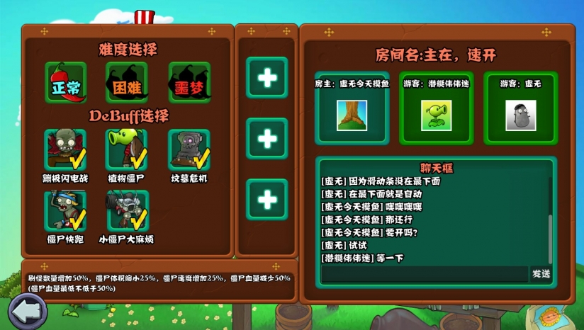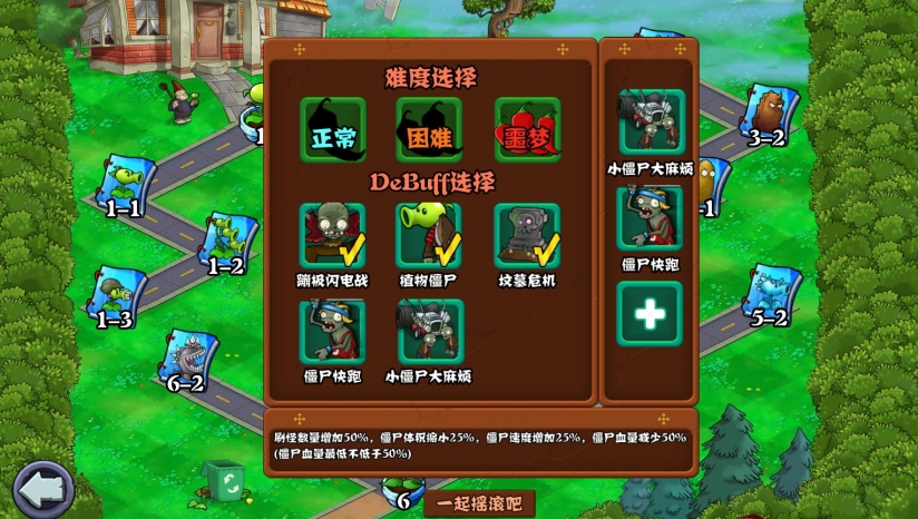 游戏设有多种难度,从轻松的新手难度到极具挑战的噩梦难度,满足不同玩家需求。还有各种debuff可选,像是减少阳光获取、加快僵尸速度等,增加游戏的挑战性和趣味性。玩家若想挑战自我,可在高难度下选择强力debuff,体验紧张刺激的战斗。