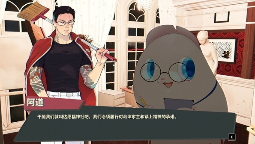 《达愿福神社》的故事舞台设定在一个被诅咒的日本小镇——过疏町。玩家将扮演曾声名狼藉的前黑帮成员阿道(由黑田崇矢配音),因种种缘由被迫流亡至此,接手了处于破产边缘的达愿福神社,肩负起将其重振的艰巨任务。在这个过程中,阿道需要与脾气火爆的助理经理Pinky☆(由涩谷彩乃配音)携手合作,共同应对各类挑战。小镇中隐藏着诸多秘密,关于阿道被迫流亡的真相也深埋其中,随着玩家深入经营神社,逐步揭开背后隐藏的犯罪阴谋。