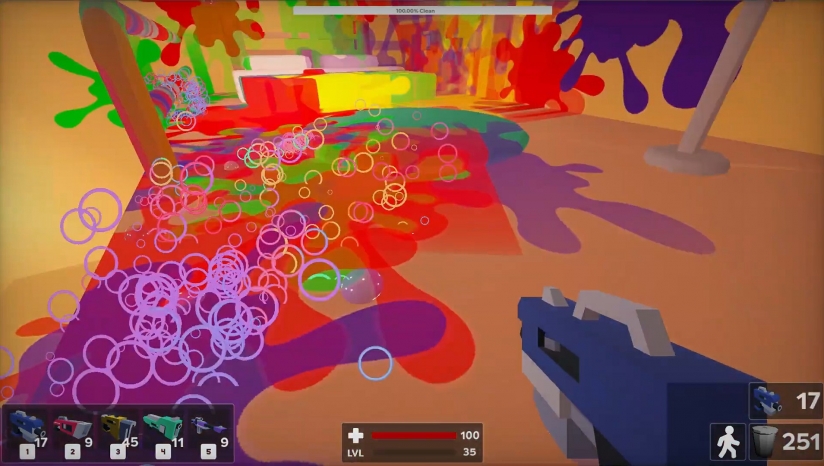 游戏刚开始,你会获得一把蓝枪,这是一款强大的清洁工具,能够去除污垢并摧毁杂物。通过发射泡泡来清洁墙面、家具和地板。也可以用来摧毁垃圾。每次清洁玩家都可以获得经验值,可以用来解锁升级你的工具。