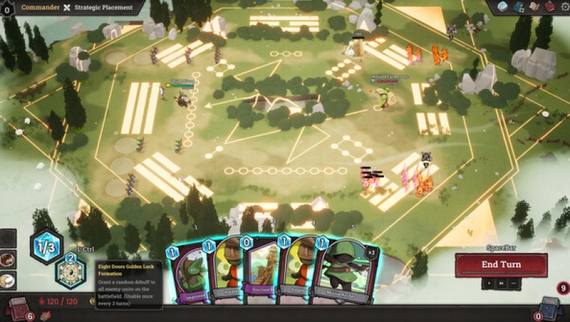 3、"危险的战斗"在每场战斗中,您可以通过将卡牌放置在召唤板块上来召唤单位。与其他卡牌游戏不同,这些单位在战场上栩栩如生,自动与敌方单位作战!一旦您结束回合,召唤的单位将根据其角色和效果移动,并与敌人交战。每个单位和战场都考虑了各种战术元素,包括铁砧与锤子、侧翼攻击等。分析遇到的敌人模式,并使用手头的卡牌做出最佳选择。