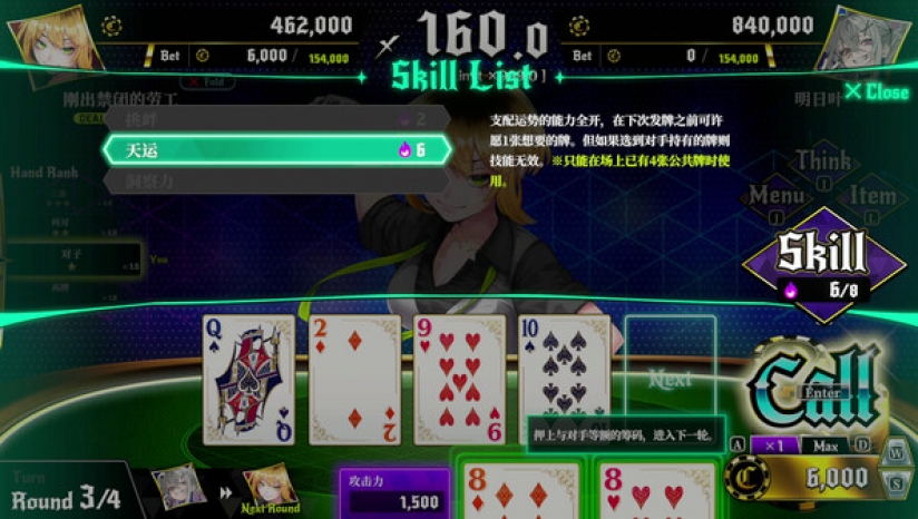 2、使用技能:明日叶可以使用赌徒天赋所带来的各式技能。使用技能可以控制手牌的牌型、看穿对手的手牌等,让牌局对自己有利。
