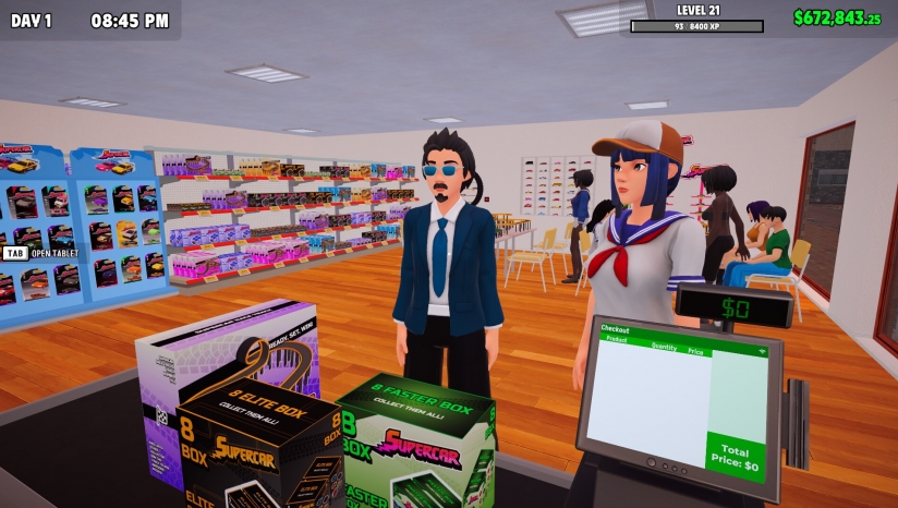 玩家需通过平板电脑联系批发商,采购盲盒并拆箱上架,根据市场需求动态调整价格(如避免定价过高滞销或过低亏损)。升级店铺设施,解锁新货架、赛车平台和装饰道具,提升客户体验与盈利能力。