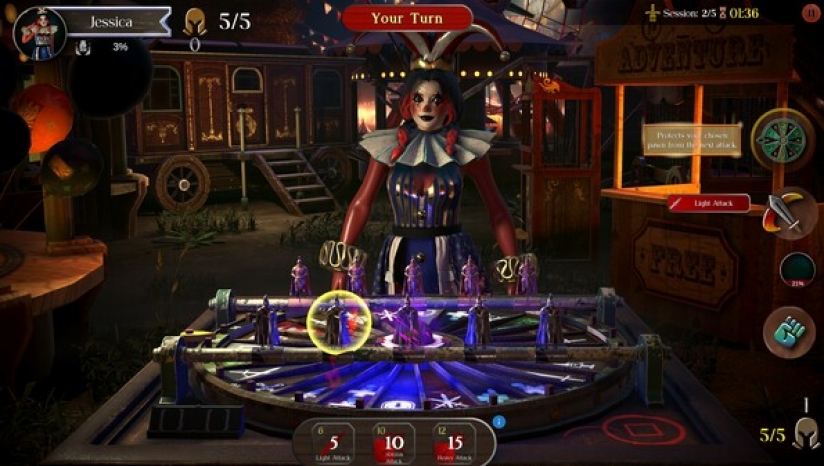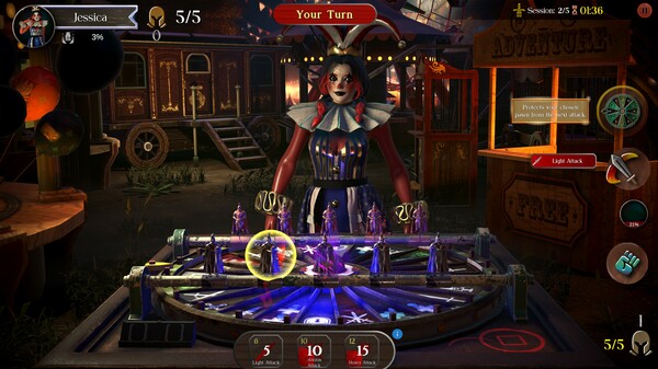 每个回合都从轮盘的旋转开始,决定你的行动。你会落在毁灭性攻击上、强力道具上,还是能改变游戏进程的特殊行动上?