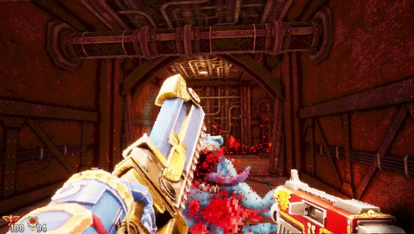 游戏采用复古像素风格,却通过精细的细节处理展现出战锤宇宙的黑暗美学。敌人被击中时会喷溅“像素血液”,链锯剑处决特写甚至会将血污溅到“镜头”上,营造强烈的沉浸感。场景设计融合了冰雪覆盖的山峰、工业废墟与混沌扭曲的异空间,动态光影与粒子效果增强了视觉冲击力。玩家可自定义画面参数,如调整像素化程度、光照强度与饱和度,既能体验原汁原味的复古风格,也可获得更现代的视觉享受。UI界面简洁直观,战斗提示与文字输入框布局合理,确保操作流畅性。
