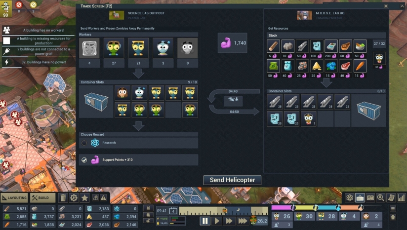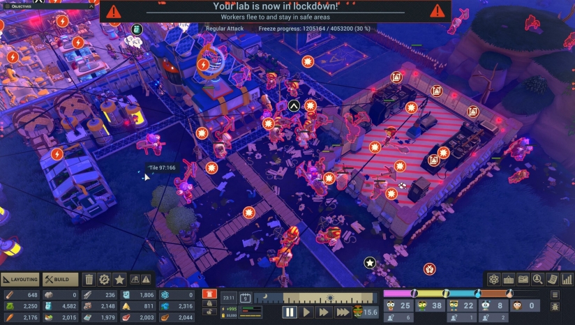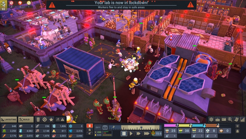 玩家需规划实验室布局,建造治疗室、研究站、防御工事等设施,并通过技术升级解锁高级设备,例如冰冻枪用于捕获僵尸,生产线用于资源转化。