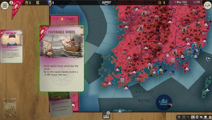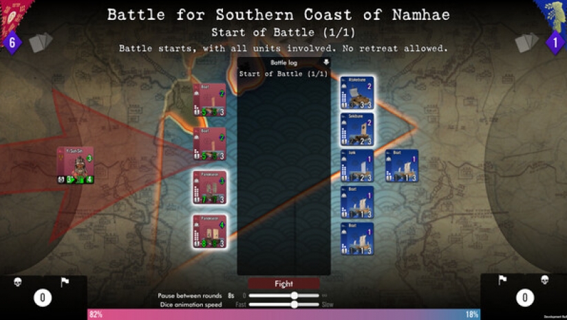 一名玩家代表日本主将秀吉的武士军队,另一名玩家代表朝鲜人,包括朝鲜和中国明朝军队。根据事件和出牌情况,双方都有可能控制满清女真部落(绿色)的陆军部队。
