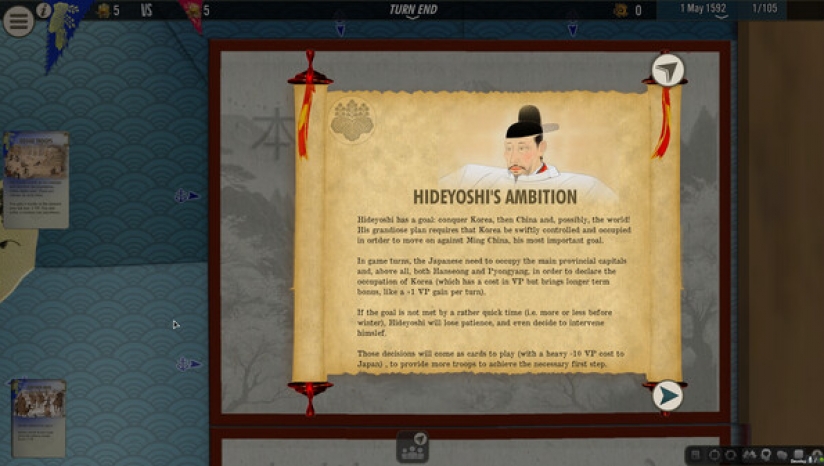 在游戏开始时,日本人拥有非常多的陆军部队,但他们的海军虽然数量众多,却很弱小,而且领导不力,他们的目标是征服整个朝鲜,以便到达并征服中国。