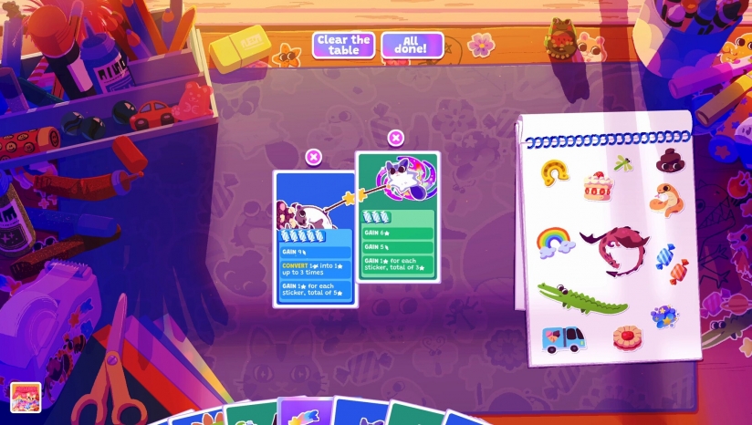 玩家可通过收集贴纸、完成任务解锁「贴纸册」,记录冒险历程。游戏支持本地与在线对战,玩家可与好友交换贴纸、切磋牌技,或加入「贴纸俱乐部」参与联赛,争夺校园排行榜的荣耀。此外,游戏提供「新手友好」设计,初始赠送两套预组牌组,并通过教学关卡逐步引导玩家掌握规则,降低上手门槛。