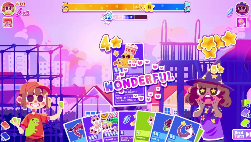 《我的牌更好!》是一款融合Roguelike元素的策略卡牌游戏,玩家需要在随机生成的每日活动中探索、战斗与成长。游戏采用「贴纸组合」机制,每张贴纸拥有独特的效果,如攻击、防御、增益或特殊能力,玩家需根据对手特点和场景需求灵活搭配卡牌。例如,用「烈焰红唇」贴纸造成范围伤害,或用「学霸光环」贴纸提升全体队友的攻击力。值得注意的是,贴纸组合存在「消耗值」限制,若牌组总消耗过高,将导致无法出牌,因此合理分配资源是制胜关键。对战以「人气值争夺」为核心,玩家需通过出牌策略积累人气值,率先达到目标值者获胜。战斗中可触发「热度倍数」机制,例如连续使用同类型贴纸或达成特定组合效果,可使当前回合的人气值获取翻倍,从而实现逆风翻盘。此外,游戏提供丰富的探索玩法:在「寻宝游戏」中挖掘隐藏贴纸;在「跳蚤市场」与NPC交换稀有卡牌;通过「卡牌交易」解锁特殊组合。每一次冒险都会遭遇不同对手,从调皮的邻家男孩到高傲的「游戏场小公主」,甚至是神秘的校外挑战者,他们将用独特的牌组考验玩家的策略能力。