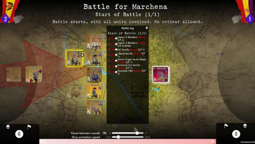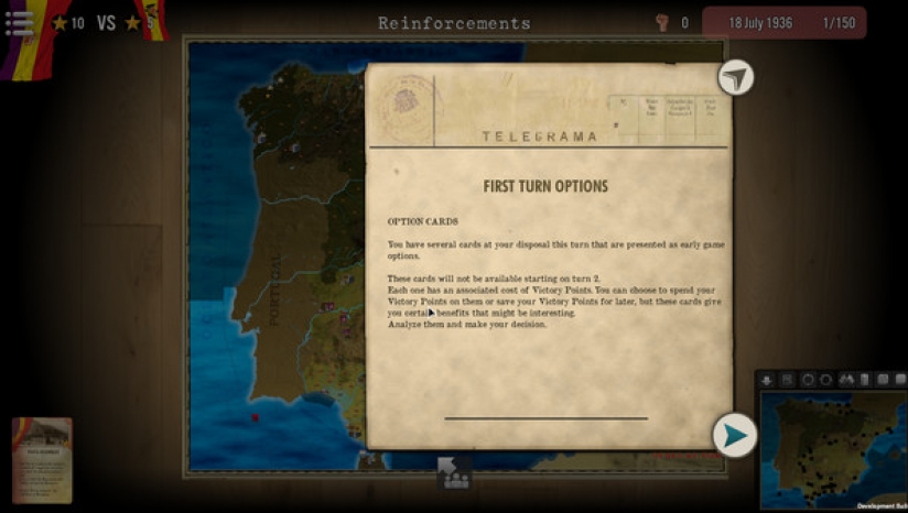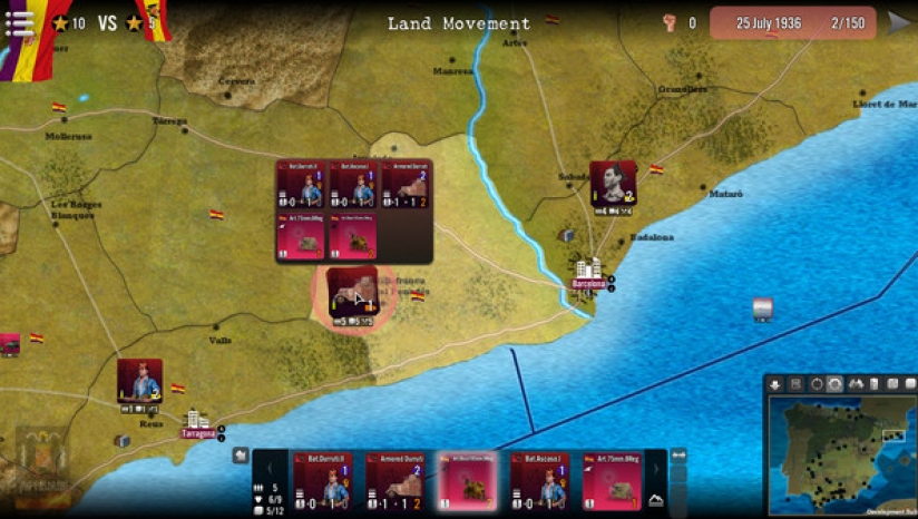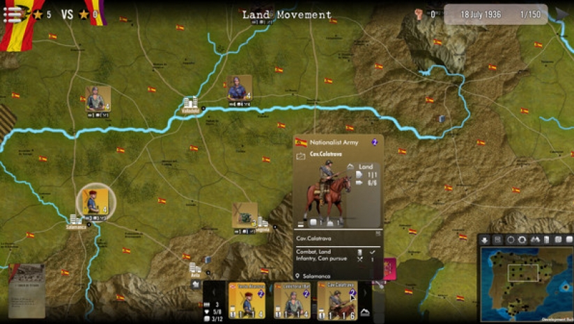 游戏涵盖了从36年7月18日开始的整个战争,采用了每周轮流的制度。作为国民党,你必须把你的非洲军队的强大部队带到半岛,控制关键城市,迫使共和国投降。作为共和党玩家,你必须延迟敌人的最初进展,同时开始建立人民军,以便准备好面对对手的正规军,特别是其老兵部队。