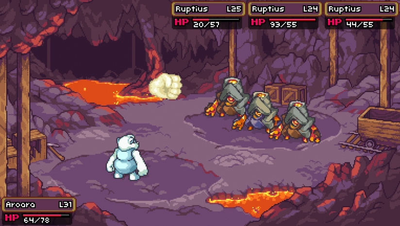 游戏采用现代化像素美术风格,角色与生物设计兼具复古情怀与精细动画(如技能特效、环境互动)。场景融合多样生态:茂密森林、炽热沙漠及冰雪洞穴均以高饱和度色彩呈现,营造奇幻氛围。配乐由Davi Vasc操刀,包含50余首曲目,灵感源于经典JRPG,强化战斗与探索的沉浸感。