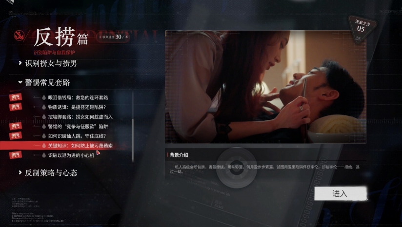 《情感反诈模拟器》以现代都市为舞台,玩家扮演主角吴宇伦——一名因被“情感捞女”骗光财产而决心复仇的“情感猎手”。他潜入名为“变凤凰”的情感欺诈组织核心,周旋于6位性格各异的女性角色之间,包括新人主播、知名博主、模特等。游戏通过虚构故事揭露情感诈骗、PUA操控、经济勒索等现实陷阱,旨在帮助玩家识别情感套路,同时探讨两性关系的信任重建。