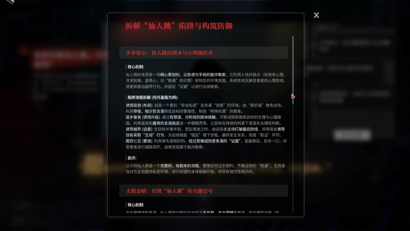 解锁14万字的《恋情知识档案》,解析105种情感诈骗套路;通过“互助留言板”分享真实反诈案例,增强现实教育意义。