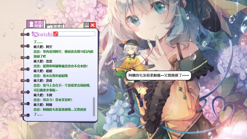 《旅行恋恋:桌面少女》以东方Project人气角色古明地恋为核心,打造沉浸式桌面宠物体验。玩家可通过触摸、喂食、闲聊与少女深度互动,触发趣味台词与表情,更能通过【根目录/Mods/Dialogues】文件自定义专属应答,甚至分享创意对话文件。游戏融合治愈养成与实用功能,支持换装系统打造个性化形象,同时集成日程管理、桌面整理等工具,让虚拟陪伴与日常效率结合。画面采用清新二次元风格,角色动作流畅细腻,光影特效柔和,搭配动态场景与背景音效,营造出温馨治愈的氛围。