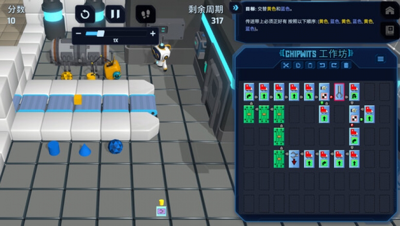 排列这些芯片,找出每个楼层的最佳解法,然后按下“播放”按钮,观看你的 ChipWit 完成任务!