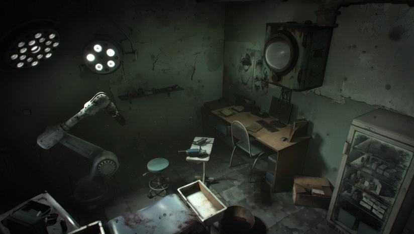 地下室诊所布满锈迹斑斑的铁链、闪烁不定的灯光及污浊的水渍,墙壁附着不明生物黏液,强化视觉压抑感。